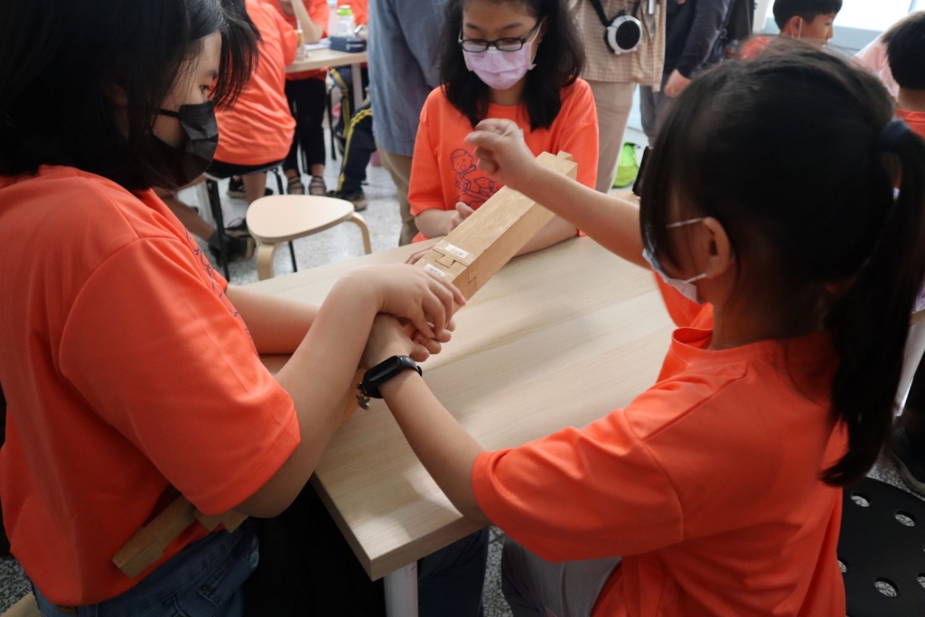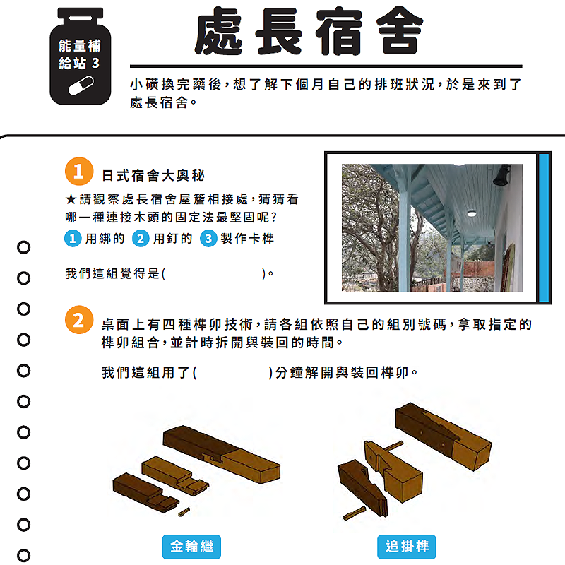 離開城隍廟後,來到了出磺坑礦區的日式宿舍群,這裡有多棟修復完成的礦工宿舍,以及過去的舊醫務所與辦公室等歷史建築,透過觀察現地的建築構造並配合榫接的模型組,讓學生了解木造建築所使用的傳統工法。