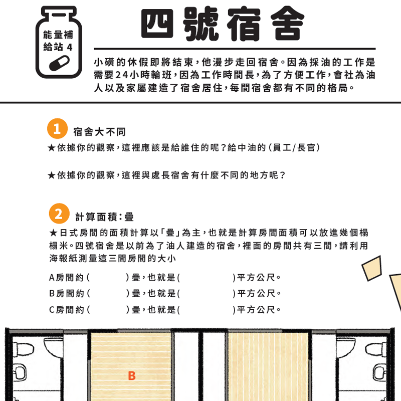 除了觀察建築外,還利用空間的機能與過去採油人的生活結合,設計數學的素養課程,例如在日式宿舍實際測量以前員工居住的空間有多大?以及計算過去採油人的排班表該如何安排等問題。