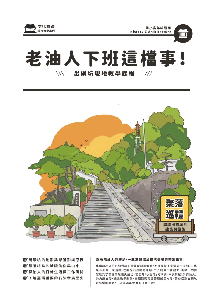 國小階段的現地教學課程主題為「老油人的下班這檔事」,學生年齡設定為國小高年級學生,課程以一位虛擬角色礦工「小磺」的生活為主軸,讓學生透過小磺在出磺坑的礦工生活經驗,一步步認識出磺坑的各種面向,並了解這裡過去的榮景。