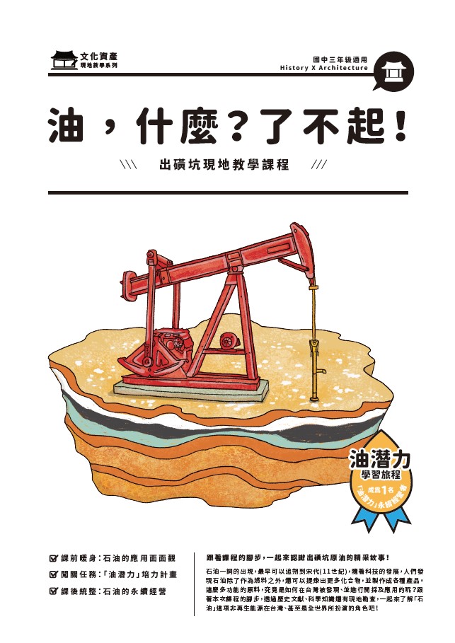 國中階段的現地教學課程名稱為「油,什麼!了不起?」,學生年齡設定為國中九年級的學生,課程內容針對「石油」為主題,帶學生從思考石油的用途開始,再到石油的開採過程,最後思考以永續發展為主的現代社會,石油這類非再生能源該如何轉型。
