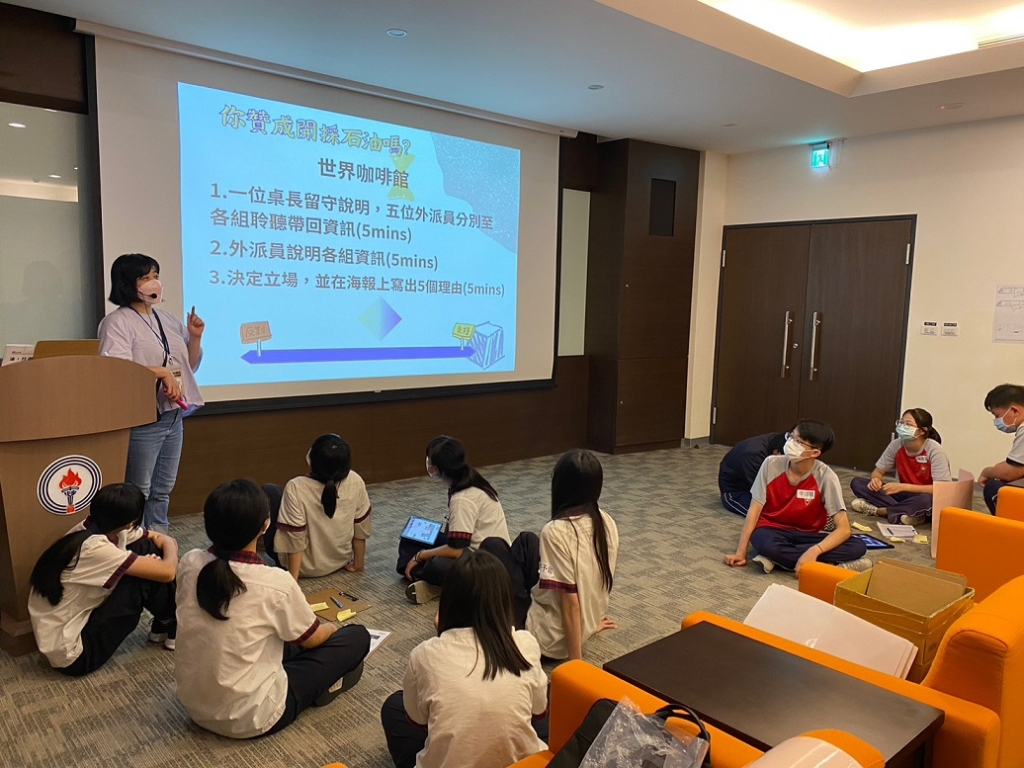 第三部分為以議題討論的方式進行課後統整,各組學生閱讀相關文章後表達贊成或反對開採石油的立場,老師透過世界咖啡館的模式引導學生討論:「屬於非再生能源的石油,該如何面對能源轉型的議題。」學生歷經了一整天的闖關活動,對石油發展的來龍去脈有了更深入的認識,因此在意見分享時可以看到各組無論是支持或反對開採石油皆能提出合理的依據。