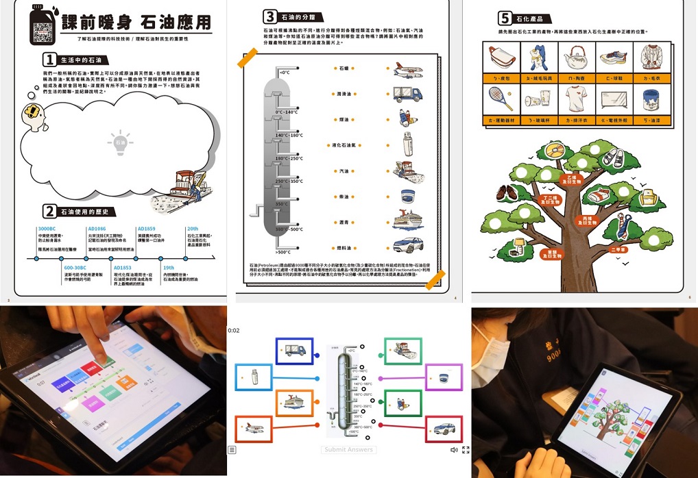 國中課程分為前導課程、現地課程與議題討論課程三部分。第一部分的前導課程在室內進行,透過歷史文獻記載,帶學生發現石油最原始的用途曾是醫療與照明,再進一步討論石油在現代社會的各種應用,並使用平板操作由Wordwall平台製作題目,利用數位線上資源的即時性,引起學生對石油開發及開採過程的好奇。