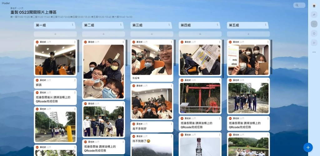 現地課程的部分同樣搭配數位媒材,讓各組學生以平板操作線上表單進行闖關,並使用Padlet(線上電子布告欄) 讓各組在闖關過程中回傳到達關卡的合照來回報進度。