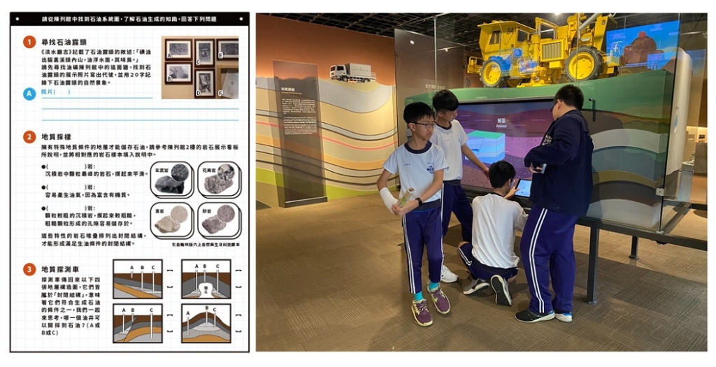 關卡一的石油探勘搭配陳列館的展示內容讓學生了解石油探勘所需要歷經的步驟,結合學校課程中地球科學的地質相關知識,讓學生更深入了解取得石油的第一步。