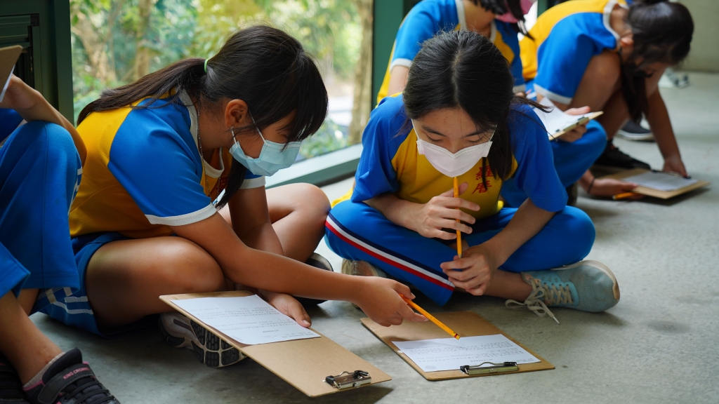 因應展覽調性,也會有不同引導方式,像是先前藝術家小笠原美環、梁兆熙的作品注重內心感受,所以學習單以動態的「靜心」與「觀察」,透過播放海浪聲音,輔助同學沉浸於眼前展場的作品,不能與人視線交會、與人討論,最後選一幅最有感覺的畫,站在前面凝視一分鐘。