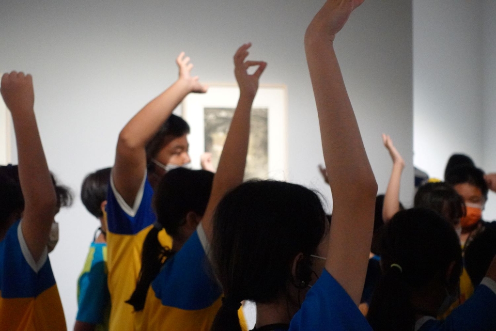 因為已經聆聽過老師導覽有基本認識,再重新去看畫作,試圖讓小朋友們重新想像畫作的觀點。雖然美術館是相對需要安靜、心境沉澱,但在移地教學的環境下,仍盡量鼓勵大家發問,讓身體動起來去沉浸在環境裡。賴建甫笑說,從學生一到美術館的整體氛圍就可略知狀態,可能很拘束也或許很奔放,都要臨機應變去調整。