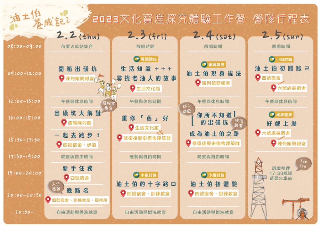 四天的營期中,學員們透過室內講座以及室外踏查深入了解出磺坑,我們邀請多位文化資產專家學者為學員介紹出磺坑,另外也邀請專業Youtuber來跟學生說明拍攝及剪輯影片的技巧,白天時大家在出磺坑園區中四處踏查,到了晚上就回到住宿的日式宿舍中繼續討論影片大綱,營隊行程非常精實。