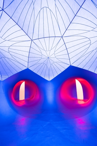 循著高第的腳步向大自然取材,光影幻境的靈感來自於自然界的蜘蛛網,向自然取材的精神也反映在不使用人工燈具的堅持,透光且染色的PVC材質在空間內形成大量搶眼的色彩,不同顏色的空間投射出的各自的個性;如大海般深沉的藍,又或是如火一般強烈的紅。
