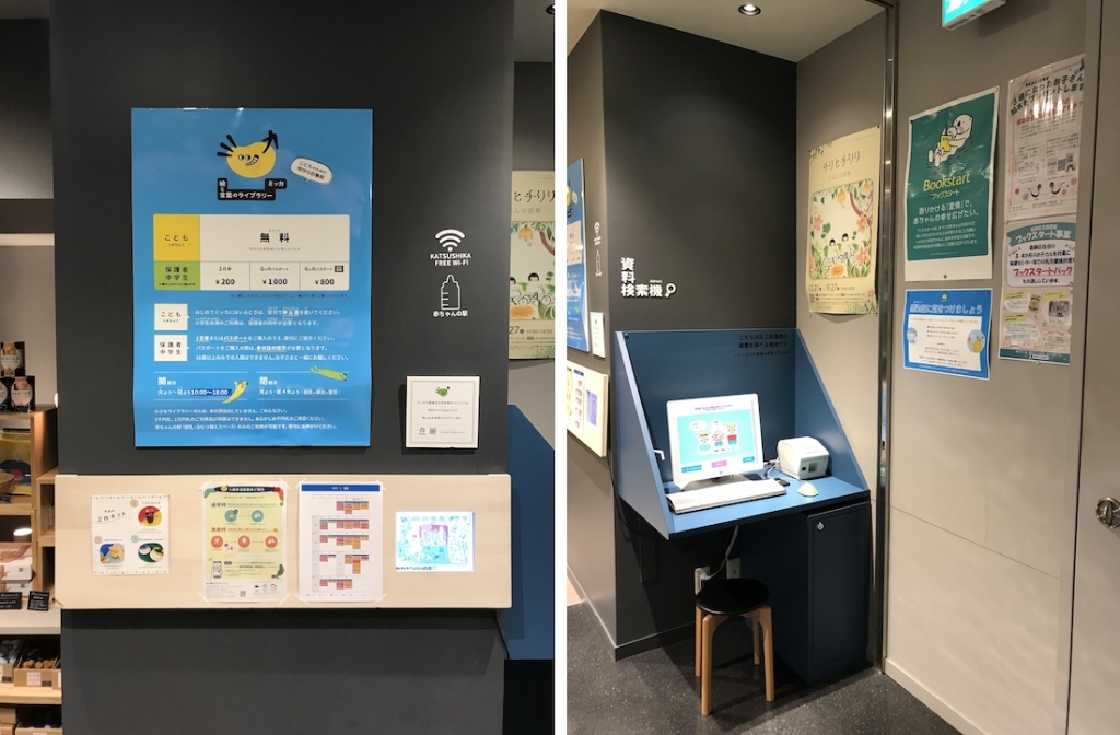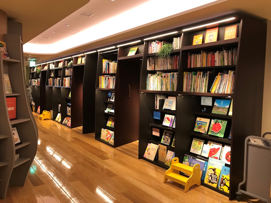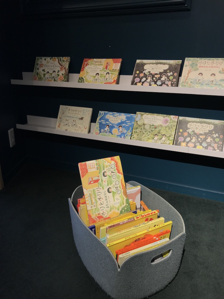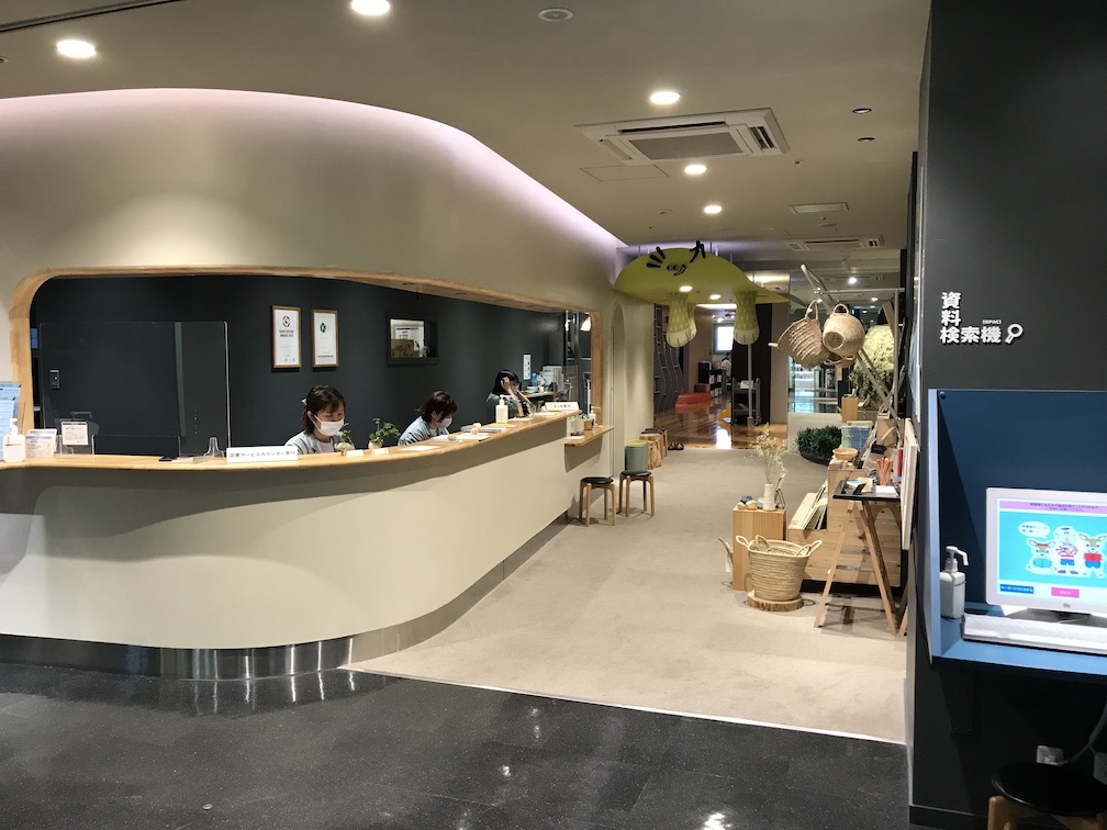 所以這裡的選書包含了繪本、漫畫、圖鑑、攝影集等「圖文並茂」的書,希望能引起還不擅於文字閱讀的兒童的閱讀興趣。書籍的陳列當然也與一般圖書館的十進分類法或是五十音順不同,而是按照自己設定的主題陳列,主題會定期更換。由於位處商業設施內部,館內難以感受到季節的變化,因此館內的裝飾會隨著四季變化。之前看到的照片有秋天的秋刀魚吊飾,不過我去的時間只有一些植物,不知道是否代表夏天。