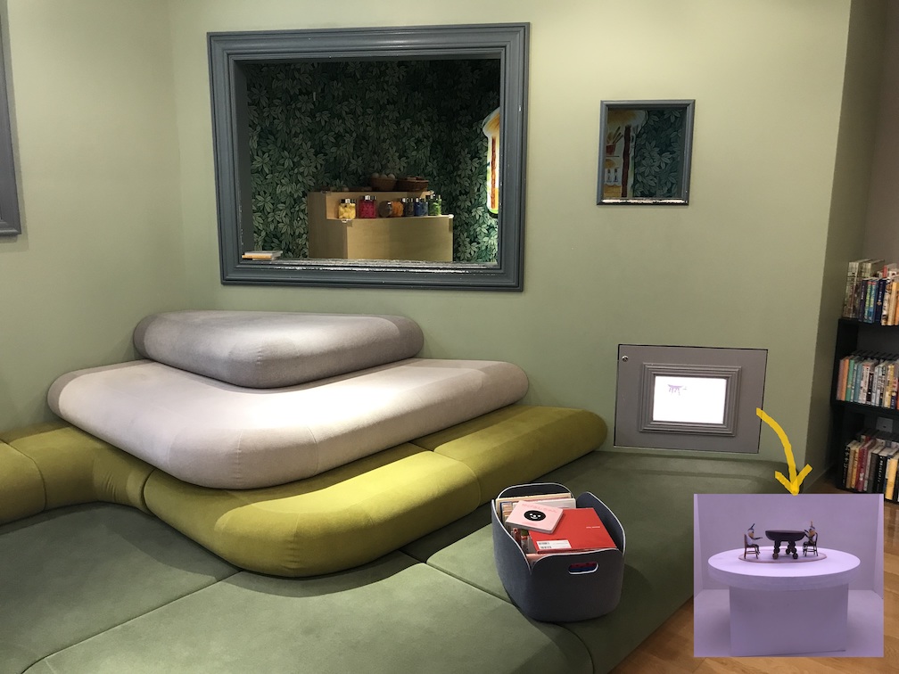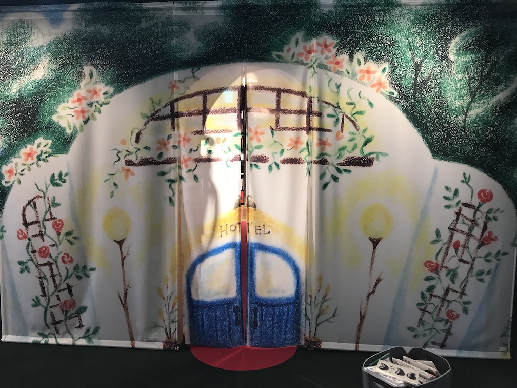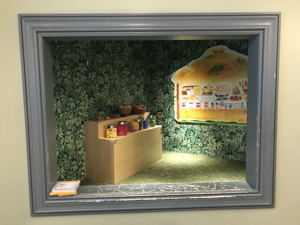 兩邊的牆壁一邊是原畫,另一面是繪本。繪本這邊還有一道簾子,掀開簾子後是劇場空間。這裡之前展過《三個強盜》,佈置讓人心動不已,就是看到照片,就讓我下定決心一定要造訪這裡。
