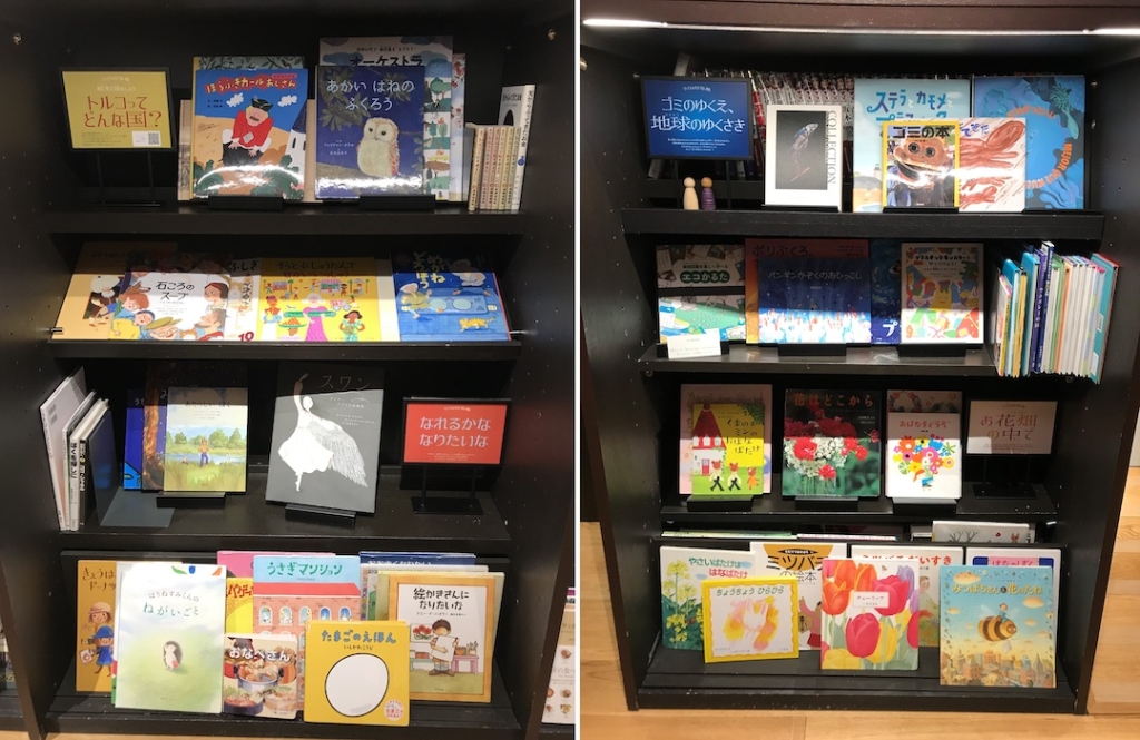 目前的書櫃特別主題有「垃圾的去向,地球的未來」、「我想變成…」「如果世界是這樣的話」、「花園」、「群馬縣作家特集」、「慢慢悠閒地前進」、「看繪本去旅行:土耳其」等。除此之外,還有一些比較常見的「夏天」、「下雨」、「食物」等主題書櫃。