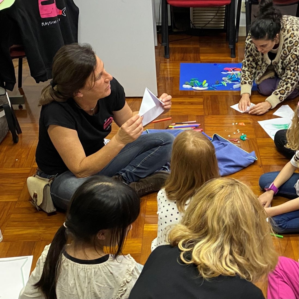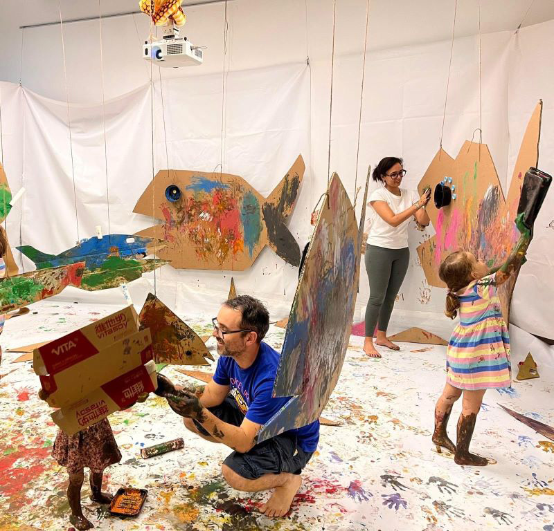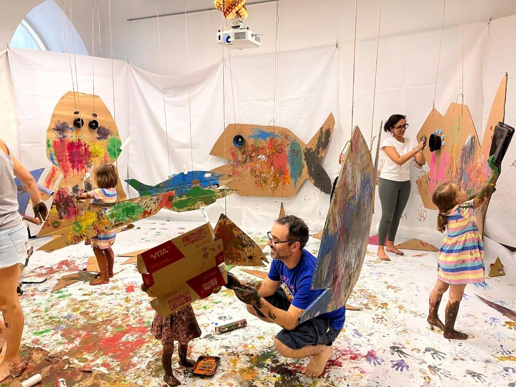 繪本作者 Andreia Martins 做自由藝術工作坊(Oficinas LibertArte),帶孩子們直接五感感受墨彩的流動來做出大海的模樣。