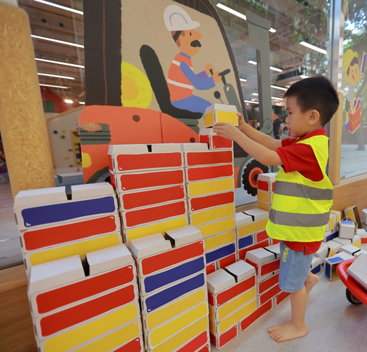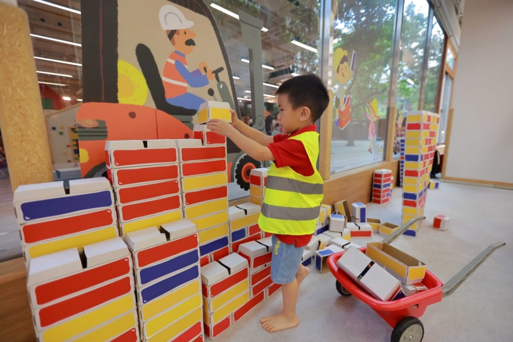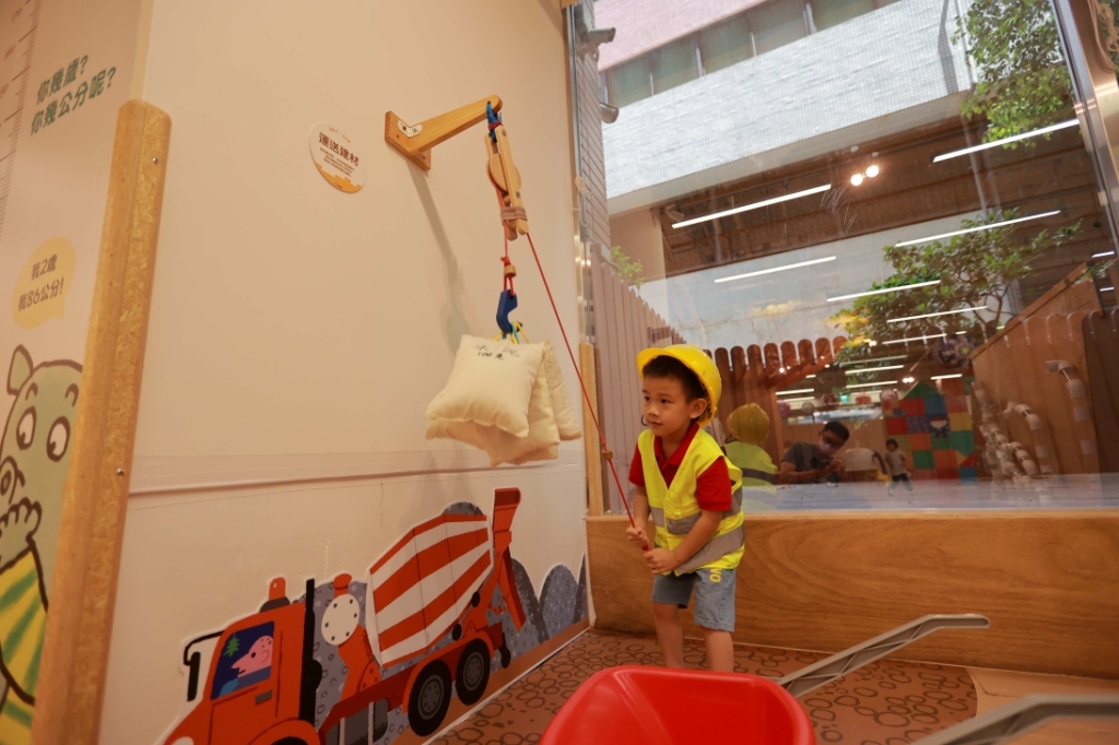 走進台北信誼親子館,便看見身穿工地背心、頭戴安全帽的小朋友變裝成小建築師、小工匠忙著蓋房子。用比擬原磚頭一比一、崁接設計的紙磚頭,堆疊出不易倒塌的牆面;一邊用輸送帶、手堆車忙著搬運磚頭,另一邊不忘用手動鏈條吊車掛送,運輸水泥、砂石等建材道具,不時傳來孩子推倒、破壞、重來的讚嘆聲…。