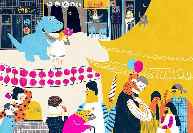 專職創作的戴維君從學生時期即開始接案,至今已有20多年的資歷。其創作以數位拼貼為主,尤其在這次入圍的作品當中,以高彩度的色塊方式做拼貼,更顯現出台灣夜市熱鬧、充滿活力的氛圍。