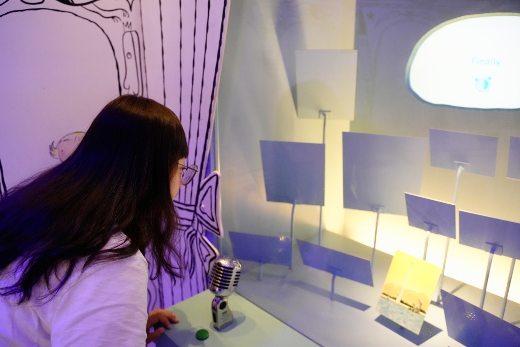 還有一個「看圖說故事的錄音間」,裡面有三支麥克風,麥克風前是片透明玻璃,裡面豎立著很多空白的立牌小卡,遊戲開始後,其中小卡會轉過來,小卡上是一張圖像,麥克風燈一亮就可以自行編故事,大約只有一兩句話的時間,錄完八到十張卡片後,就會將剛剛錄過的聲音全部播放一次,讓你聽聽自己即興發揮的故事。圖像與圖像之間沒什麼關聯性,不同人講出來的故事也會差個十萬八千里,滿好笑的。