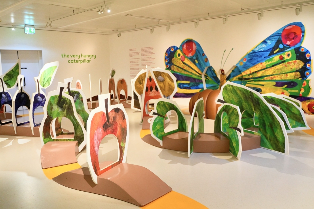 館方設計了超多好玩的互動機關,幫助小小孩學習 ABC 字母,非常推薦帶 0-6 歲孩子前往遊戲(而且 1 歲以下的寶貝不用門票)。在工作人員的推薦下,我們直奔二樓(以台灣習慣説法應該是三樓),一走上樓梯我就超誇張地「哇」個不停,出現在眼前的是繪本界的聖經《好餓的毛毛蟲》書中場景的立體化裝置,雖然以前在出版社工作的時候,就因為策展和舉辦閱讀推廣活動的緣故,早已做過無數次類似的場景,但那些都是有時效性的,活動一結束就沒有了,看到荷蘭這裡有常駐型的佈置真的好感動喔!