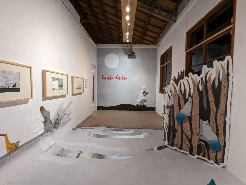 《Guji-Guji》繪本傳達自我認同,展間再現繪本主角於湖邊肯定自我的場景,呈現繪本主角重要情感轉折的畫面,帶領觀者進入第一視角,並使用哈哈鏡般的鏡面紙製作湖面,映照出不一樣的自己。以互動方式讓民眾感受在場景中閱讀、思考的趣味,跟Guji-Guji重新找回自己。