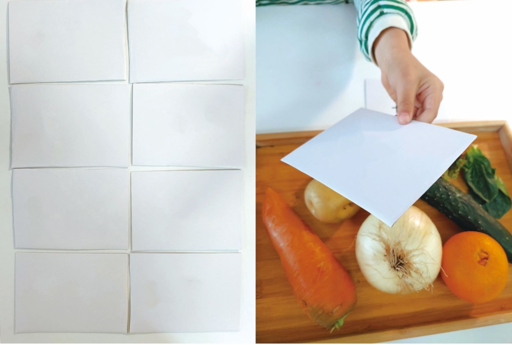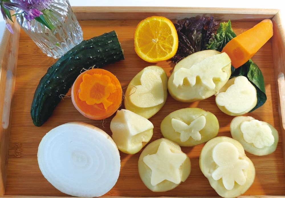 讓孩子瞭解食材也可拿來當美勞材料。探索各式蔬菜的同時,亦能熟悉字母與圖形的形狀。