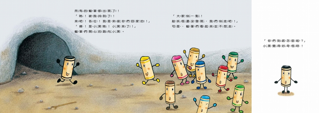 蠟筆接連失蹤,大家都很害怕,懷疑是「妖怪」做的好事……而最後居然只剩下蠟筆小黑!孤單的他展開拯救蠟筆大行動,循著線索一步步前進,還鼓起勇氣進入黑漆漆的洞裡面……終於!他找到同伴了!可是,大家看起來一點都不害怕,甚至不想跟著小黑離開……這究竟是怎麼回事呢?