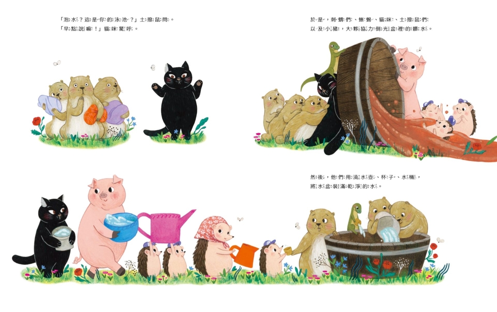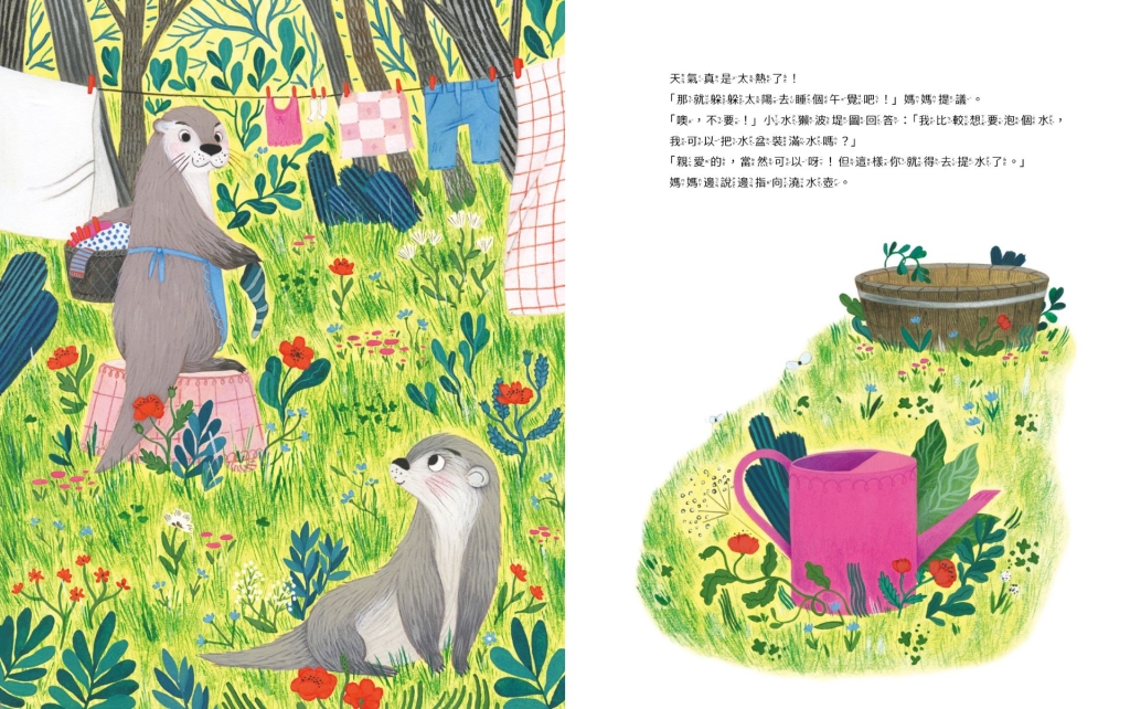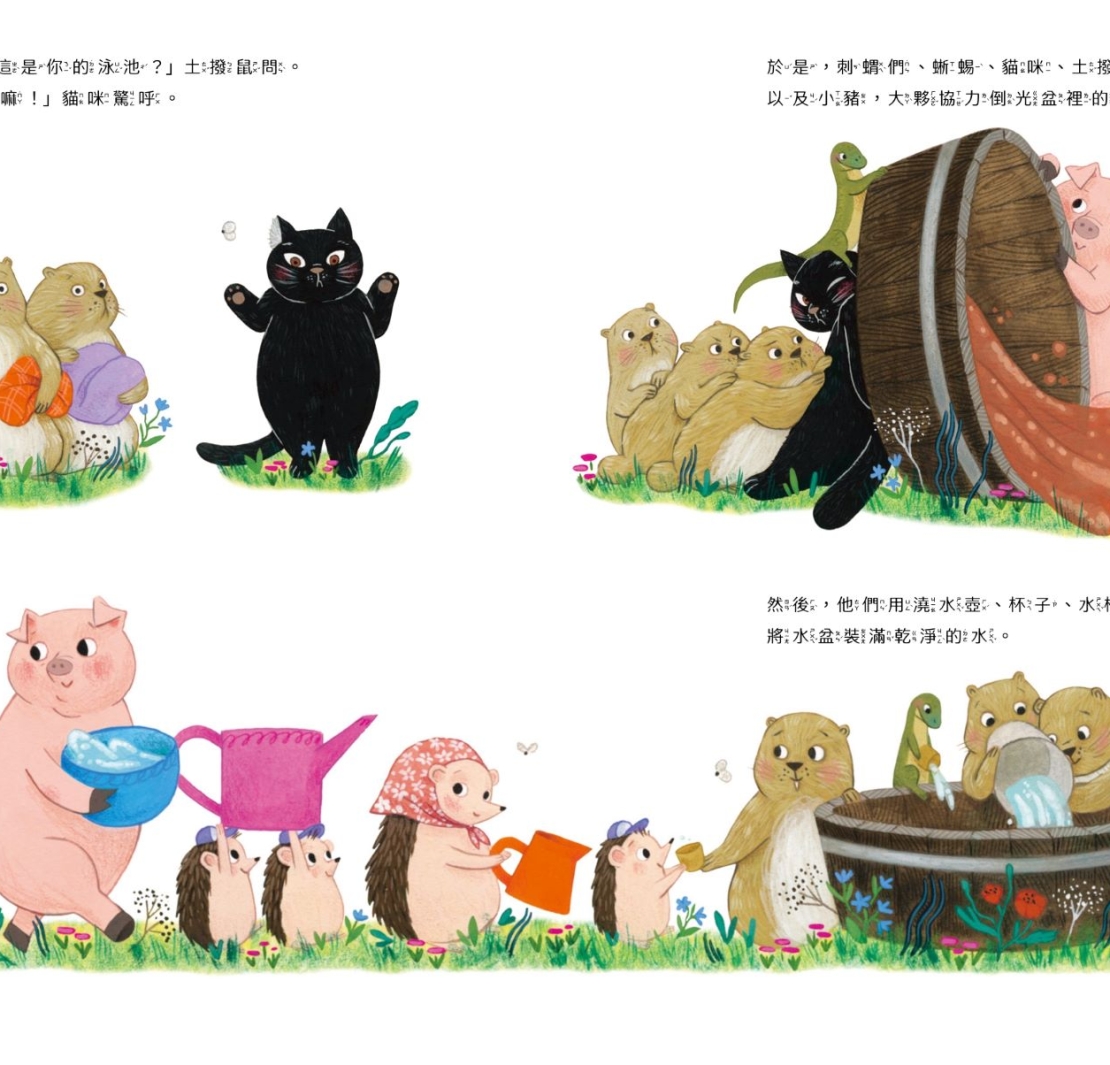 炎炎夏日,小水獺波堤圖一如所有的孩子那般,游泳玩水是最開心不過的事了。他自己搬來水盆,手拿澆水壺,興奮地來回取水、倒入。但,好事多磨,他回來時,他的水盆居然成了刺蝟媽媽餵著小刺蝟們喝水的「飲水器」;這還不打緊,待刺蝟家庭離開後,波堤圖繼續倒水,再度回來,有隻蜥蜴正在裡頭划船呢!
