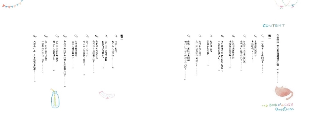 「目次」可幫助我們讀者一目瞭然整本書的結構與內容。就像《一隻貓會有多少問題》這本書,從目次可看到全書分成「四輯」,每輯都有「8個問題」。雖然,作者在「封底」提到這四輯是依「閱讀理解能力」依序加深,但欣希建議大家可先瀏覽整個目次,挑選出三首感興趣的詩。