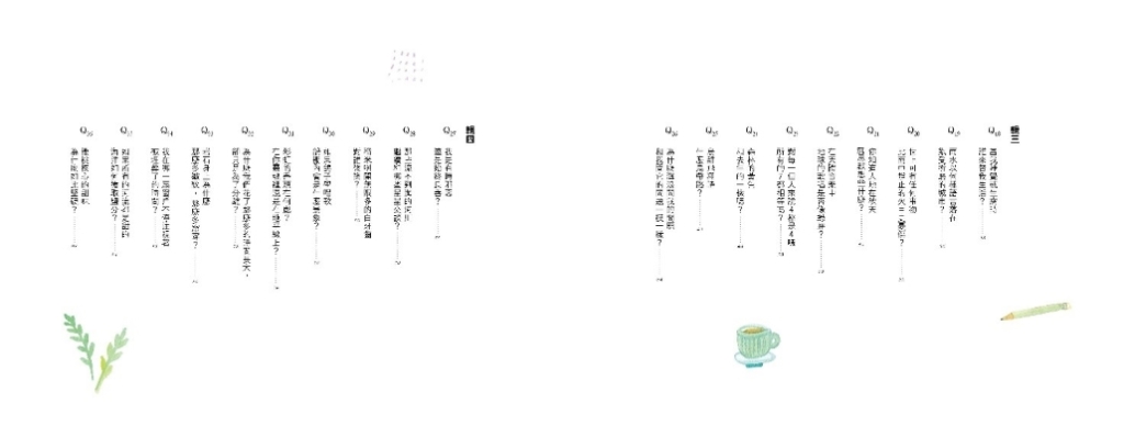 (欣希:挑選了「1. 一隻貓會有多少問題?」、「23. 對每一個人4都是4嗎?所有的7都相等嗎?」、「30. 如果鴿子學唱歌 鴿棚內會是什麼景象?」)