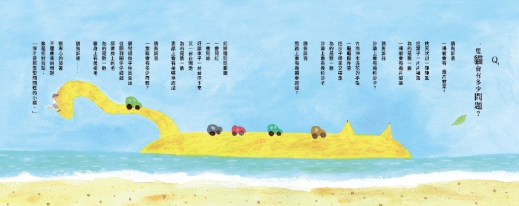 就以〈一隻貓有多少問題?〉這首詩來說,內文有五個段落,均是以「請告訴我」開頭。其中一個段落是「請告訴我 馬路上會有幾輛車經過?」。若是太認真,接續的內文就會是「幾點~幾點之間,大約會有OO輛車經過吧!」,但作者卻寫著:
