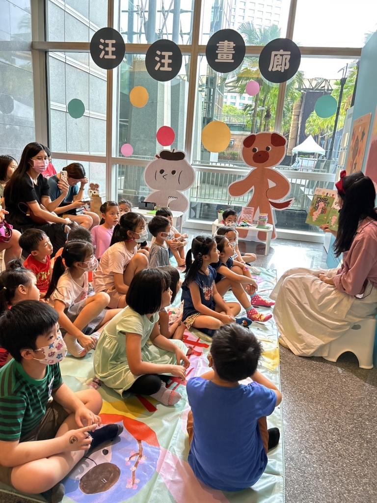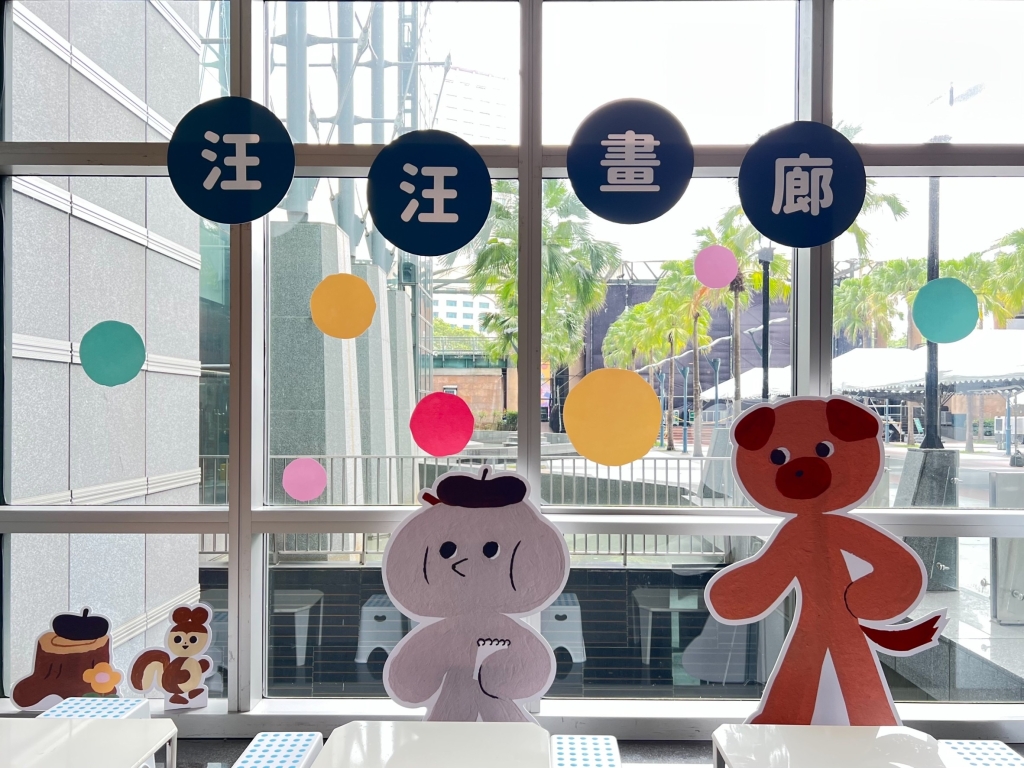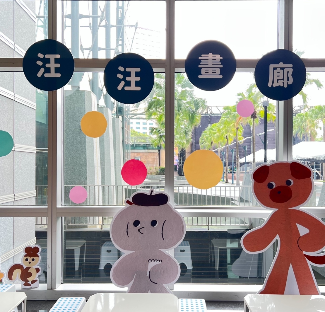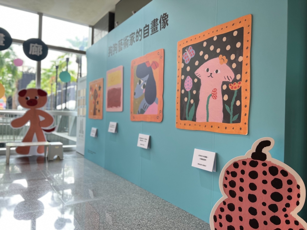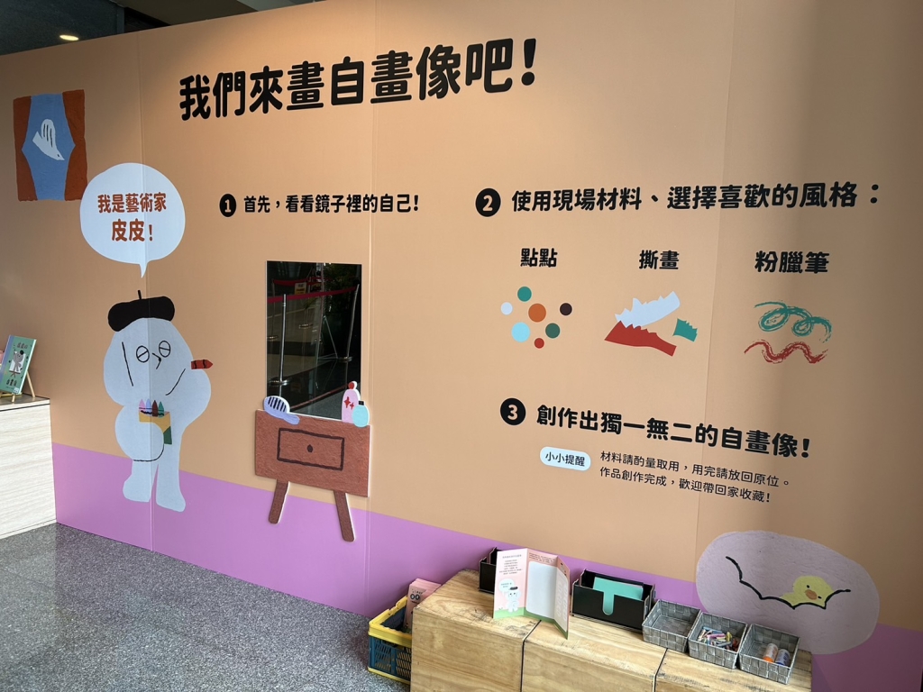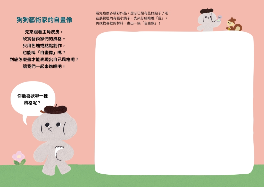 新北市政府一樓大廳的「魔幻世界」展區,西側凹槽展出小典藏繪本《皮皮的自畫像》主題展區」,把書中的「汪汪畫廊」實體化,不只展出狗狗藝術家作品,邀請親子朋友打開藝術眼,另一邊的創作區,讓觀者動手一步步完成自畫像的創作,想想看什麼風格的自畫像,最適合自己呢?