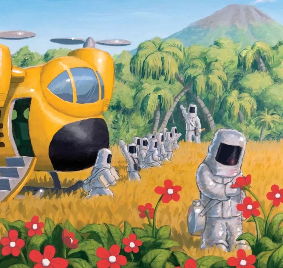 亮眼的黃色直升機朝著我們視覺的一點鐘方向駛來,像是可以聽見轟隆隆的引擎聲,遠離大海準備邁向另一個探險──跨頁的遼闊視角,來到這次的目的地──火山島。火山口冒著煙,深陷的洞口裡會有什麼?那一縷輕煙,成功勾起讀者的好奇,也忍不住情緒的緊張,臆測著情節的發生。