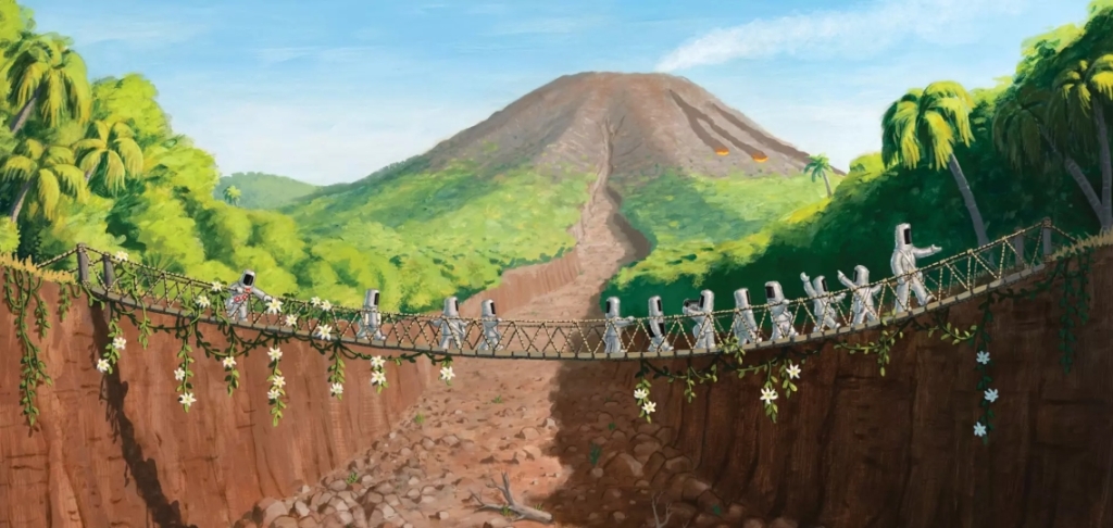全書以不同的畫面篇幅大小與滿版跨頁相互穿插補敘,表述正在做的「動作」、行進的「過程」,還有定點的「景色」!串起豐富的故事內涵,讓我們得以真正一窺火山洞口裡的面貌。