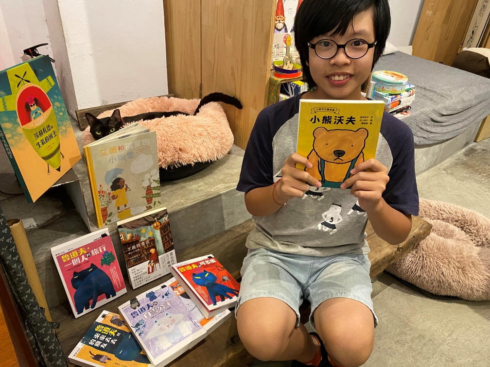 暑假開始前,我就讀到了《小熊沃夫》,這本在我還沒出生前就出版的故事集今年又重新再版,我非常喜歡小熊沃夫,媽媽問我現在讀會不會覺得太簡單了,我覺得故事或許很簡單,但是透過小熊沃夫看世界的角度,一切都是新鮮的,大人覺得太簡單的東西裡,小孩永遠可以發現有趣或奇怪的地方,在「魚為什麼沒有舌頭?」這篇中,小熊想要擺脫身上的毛皮當一棵站著就能涼快的樹,又想要變成蜜蜂,有吃不完的蜂蜜,當他看見河裡的魚,又羨慕起魚可以在河裡戲水,不會口渴也不會玩得全身都泥巴,小鯽魚告訴他身為魚可是很艱難的修行,要忍受冬天河水冰冷,睡覺還不能閉上眼睛,小熊沃夫最不能接受的是魚沒有舌頭,這樣就不能舔他最愛的蜂蜜了,他這才發現能當一隻有舌頭舔蜂蜜又有手可以抱媽媽的小熊是最棒的,讀到這我會心一笑,和沃夫一樣恍然大悟了,我們常常羨慕別人,卻不懂得欣賞自己,很多煩惱都是因為這樣發生的,我喜歡這樣讀《小熊沃夫》輕鬆地思考和排解疑惑,期待即將要出版的《小熊沃夫》第二集!