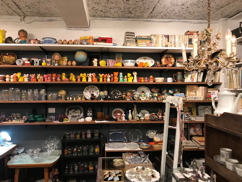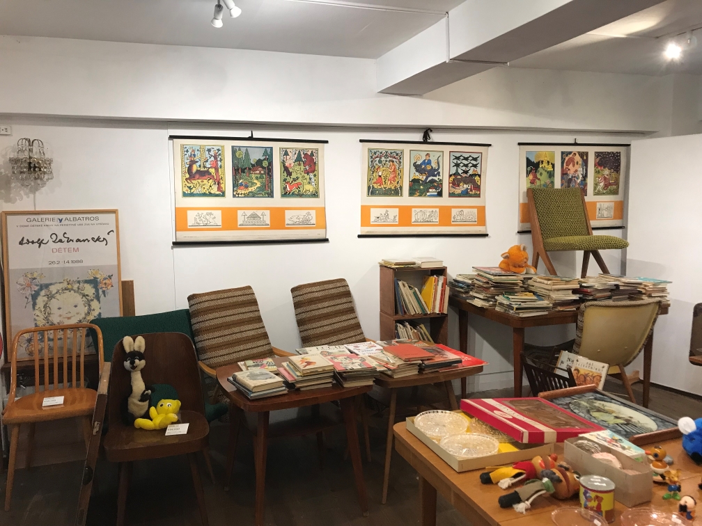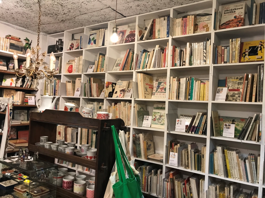 我再度回到一樓,當天人潮不少,主要都聚集在挑選捷克的玻璃鈕釦。繪本在最裡面的一面牆上,小心翼翼穿過中間的玻璃陶器雜貨區,走到後面的繪本區。