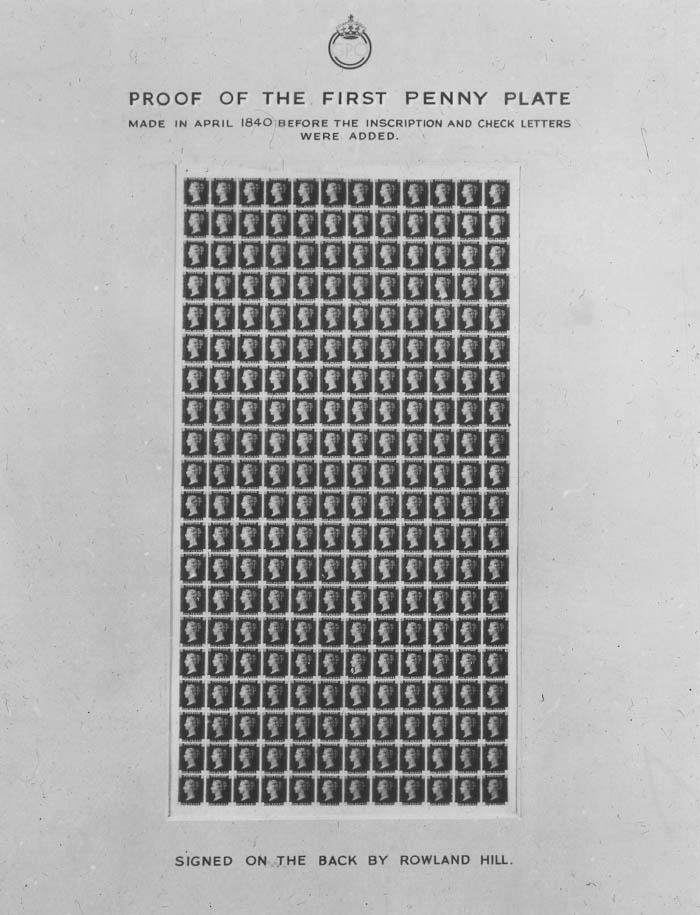 仔細尋找一下,有看到寫著「Proof of the first penny plate」的展品嗎?中央貼著一頁黑白相間、一格一格、有著女士側臉頭像的郵票即是羅蘭希爾爵士(Sir Rowland Hill)於1840年發行的世界上第一枚郵票-「黑便士」(Penny Black)。黑便士郵票上的頭像正是18歲的英國維多利亞女王(Queen Victoria)。在信封上貼郵票等於已付過郵資的憑證,也是我們現今寄送信件時的認證方式,因此羅蘭希爾爵士(Sir Rowland Hill)也被稱為「郵票之父」。