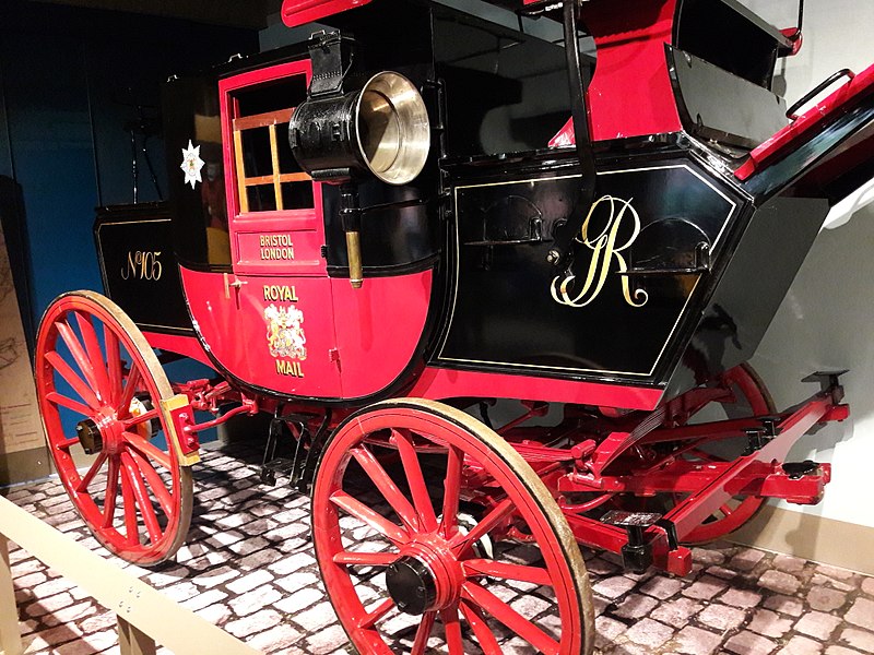 看到那輛車身上層為黑色、下層為紅色的四輪馬車車體了嗎?這是18世紀郵差先生遞送信件所使用的交通工具!我們再靠近一點觀察,車門上寫著「Royal Mail」、「Bristol」、「 London」。「Royal Mail」是現今還在營運、最具規模的英國郵政公司。「布里斯托Bristol」與「倫敦London」則是英國的地名,代表這輛馬車運送信件的起訖地點!前者是英國西南部的一個城市;而後者則是英國的首都,兩地相差190公里左右,即使是現今開車前往也要花上2至3小時的車程,更何況當時還只能用馬車呢!