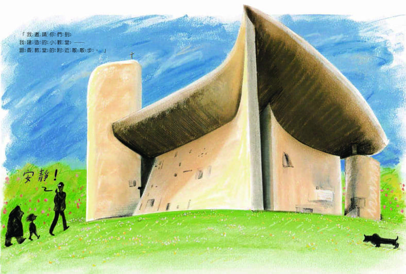 最後介紹柯比意的故事本書特色,說明文字精簡清晰,插圖線條流暢配色冷暖對比鮮明中帶點復古風,故事鋪陳則由柯比意本人介紹和帶小狗的爺孫當觀眾,時而輪流出場,時而同時出現,讓原本知識性的內容更生動,更具臨場感。閱讀完本書,相信父母和孩子們一定迫不及待想去參觀柯比意設計的建築呢!
