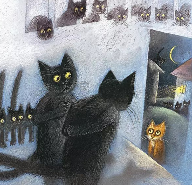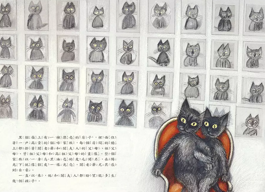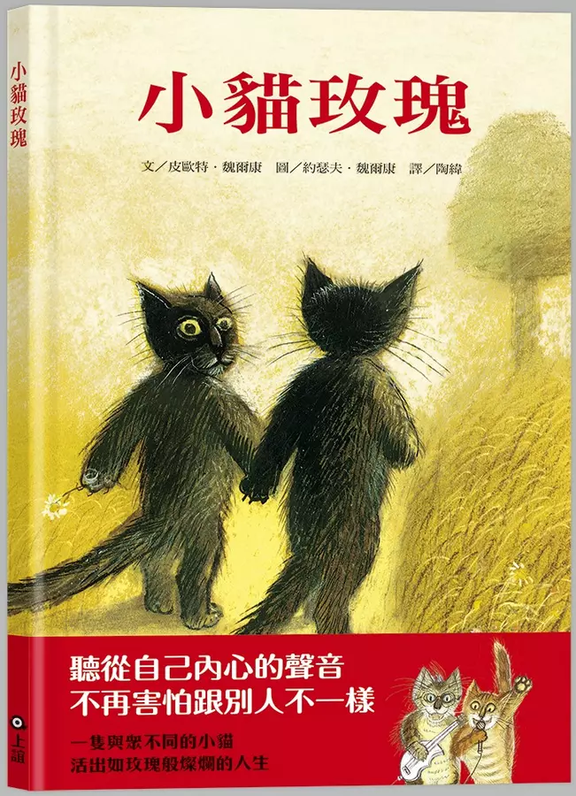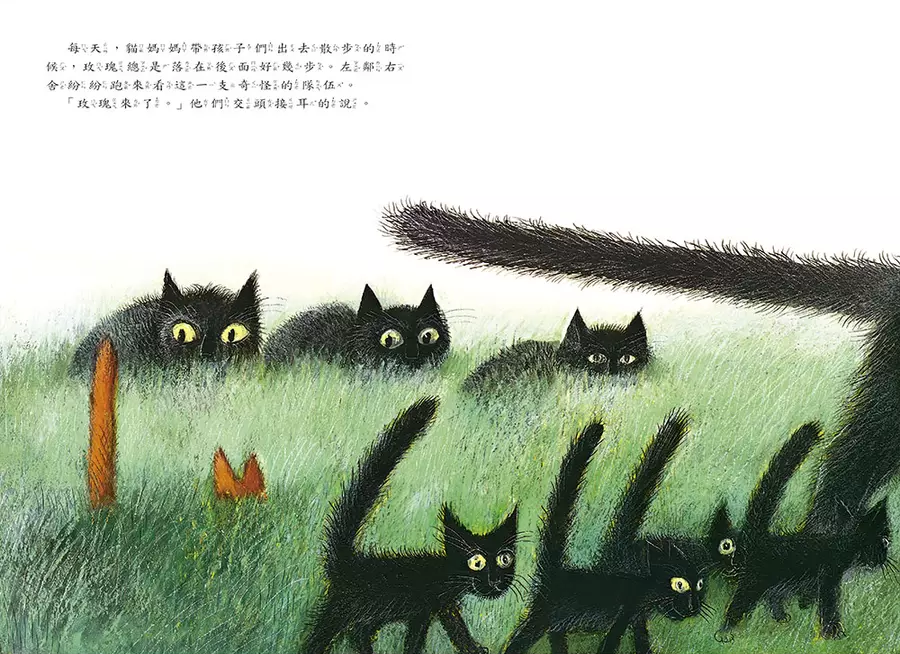 《小貓玫瑰》(上誼文化)是歷時40年波蘭經典圖畫書,封面有兩隻黑貓似是相望著,鏡像的設計讓人乍看誤以為是不是同一隻貓,但仔細觀察肢體姿態,則能發現彼此差異。