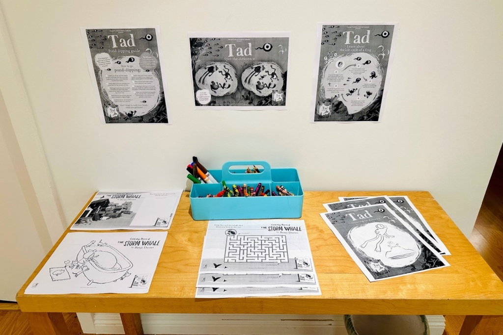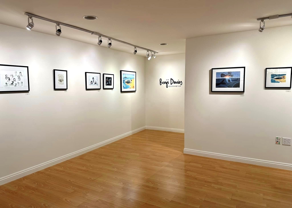 這次十分難得的是繪本插畫家Benji Davies(班傑・戴維斯)從英國飛來這裡辦個人畫展,戴維斯以《那天來的鯨魚》(The Storm Whale)系列繪本(阿布拉出版)聞名,他的作品台灣翻譯的還有《爺爺的天堂島》(采實文化出版)以及《小蝌》(維京出版)等繪本。