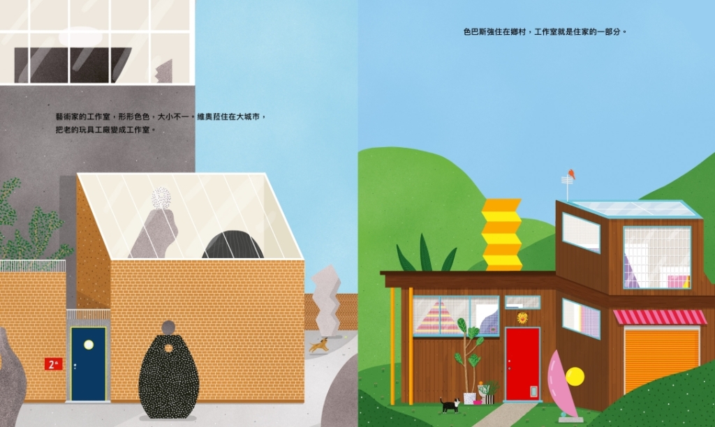 在這8頁的「藝術家幕後」中從兩人的對照,到以跨頁及不同景深描繪出工作室規模的差異,畫面中滿滿的細節:有材料、有工具、有各司其職的夥伴,不約而同的兩個工作室場景中都出現了「進度表」!悄悄點出打造一場精彩的展覽,可是需要良好的時程控管。如果說展覽開幕日是展覽製作的截止日,製作過程中的每一個延誤,都有可能造成展覽無法順利與大眾見面。