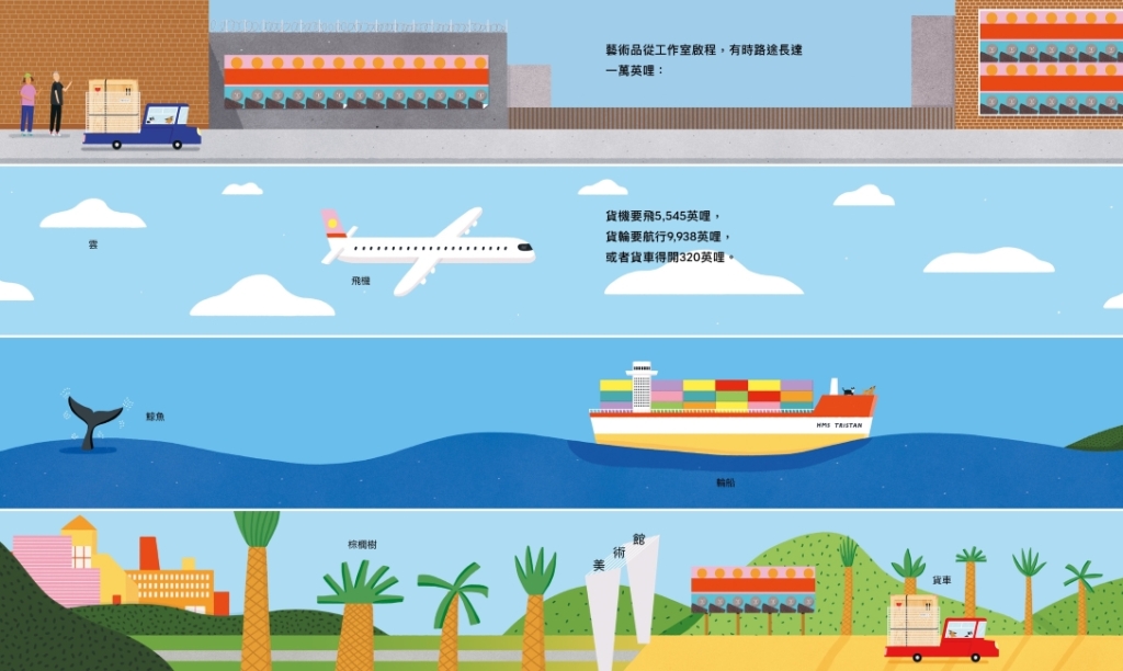 藝術家要參加展覽了!作品怎麼去美術館呢?專業的藝術品包裝運輸公司讓作品能安穩地被固定在木箱內,準備長途的運送。運輸也是一門學問,考量時間與地點(想一想,如果是在國外美術館展出?),可能會利用到不同交通工具來運輸作品,甚至一件藝術品的運送會用到2到3種不同的交通工具呢!作者用了3頁的篇幅來說明在展覽製作中最為隱形卻是極為重要的一段過程,連結了藝術作品從藝術家工作室到美術館的過程。隨著兩位藝術家作品抵達美術館,越來越多人將加入展覽製作的「黃金團隊」中!
