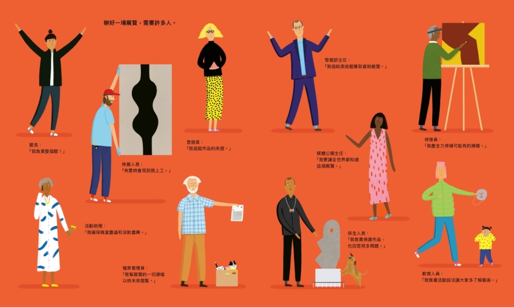 儘管面對小讀者,作者仍仔細地讓「黃金團隊」的成員從展覽的幕後躍入我們眼前。以展覽主題立場出發的策展人,負責選件與佈展的安排,透過小模型思考著怎麼說故事。「辦好展覽,需要許多人。」也有從機構立場出發的館長、發展部主任;有從觀眾體驗立場出發的教育人員、媒體公關主任與活動助理。雖然在書中未提及,但展示設計師與燈光設計師會從設計立場來規劃展覽中身體與感官體驗,佈展人員則會悉心地執行這些設計細節,讓展覽完美呈現在觀眾眼前。對美術館來說,展覽通常有時限,為了研究與推廣的需求,每檔展覽紀錄都十分重要,這個重責大任就會由另一個展覽幕後的角色—展覽專輯與畫冊的「編輯」來負責。