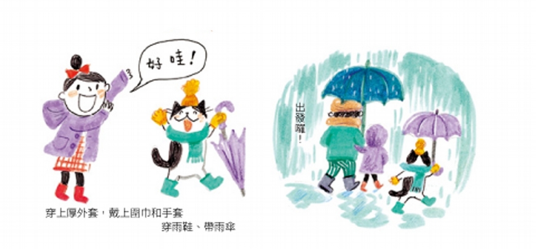 穿上厚外套,戴上圍巾和手套,穿雨鞋、帶雨傘