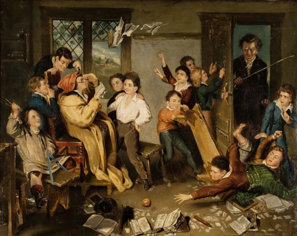 學校教育,畫中有飛在空中的書與頑皮的學生,這幅畫很常用於當時德法地區的教育宣傳。