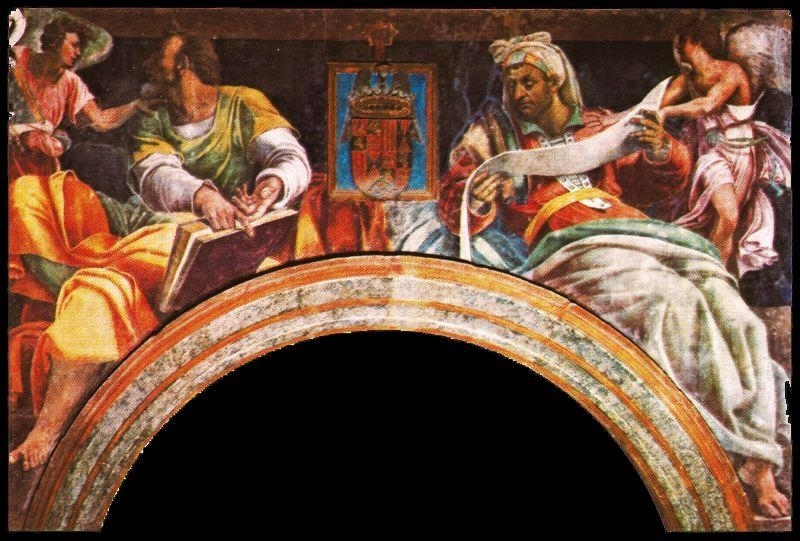 畫中左手邊,手拿著「書」的,是耶穌12使徒之一的馬太,也是聖經四福音書中,馬太福音的作者,代表耶穌基督降臨的主後年代;右邊手中拿著「捲軸」的,為先知以賽亞,代表舊約時期的主前年代。