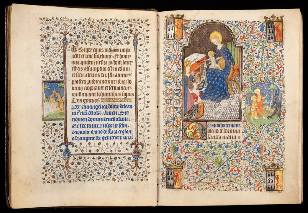 最早在中古時代的畫作中,「書」最主要的,便是代表上帝的語言——聖經!不但標示著至高無上的力量,也象徵著耶穌基督。其中有趣的地方便在於,儘管書經常出現在中古時期的繪畫裡,但你可以發現,此時期繪畫裡的「書本」,通常是指耶穌降臨後的主後年代,也就是「新約」時代。至於舊約聖經裡出現的先知,則大多伴隨的是捲軸!另外聖母則多半伴隨著「時導書(Book of Hours)」出現,這是一種中世紀的祈禱書,有許多的裝飾,內容則是短篇的祈禱文和聖經裡的詩篇合集。
