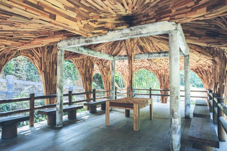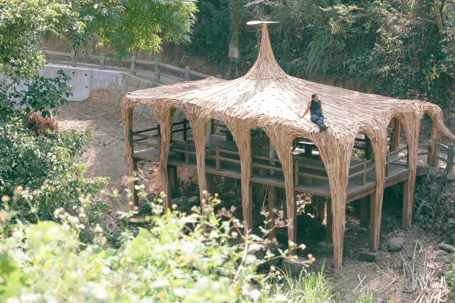 在護魚的河岸上方,有著一座用木條拼組出的小木屋,這是來自花蓮港口部落的藝術家Iyo Kacaw 伊佑噶照,用在地三種木材拚裝出,細看木條堆疊出的層次,更像是鑿穿水圳的痕跡。屋頂上有著兩片像破頂而出的樹芽,想想看藝術家這樣有什麼特別的想法呢?
