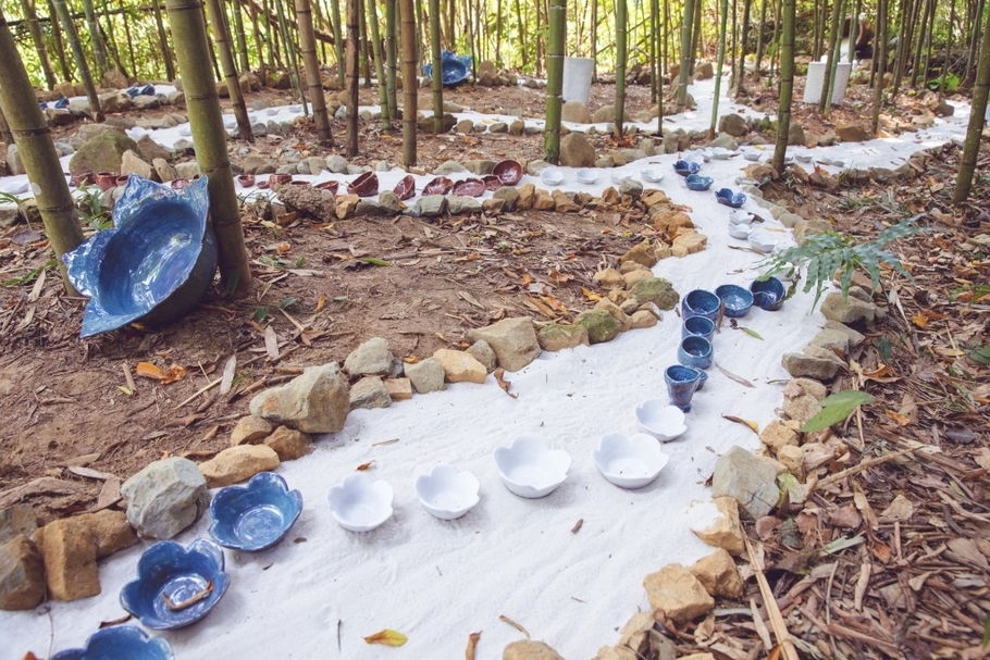掛在竹林上頭的茶碗,也是呼應客家人為了防豬油被老鼠偷吃,會把裝油的碗綁上繩子掛裡來存放。