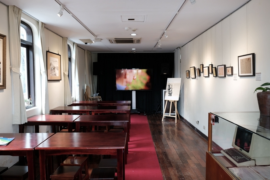 展覽內播放影片介紹林語堂的故事,觀眾可以坐下來欣賞。