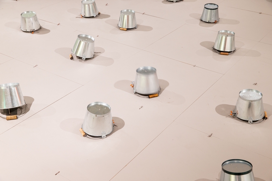 這一次教育計畫的四位藝術家作品,其中,徐瑞憲《一種行為》將蒐集而來的鐵皮水桶裡置入馬達,以機械動作與外觀擬仿童年在沙灘看到的寄居蟹;他也在《痕跡》作品中藉由動力機械規律、節奏的運行,劃下時間的軌跡。