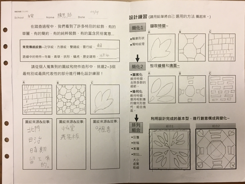 在正式彩繪在立體的「小感動鼠」之前,老師先引導學生把出去調查時記錄的圖案,練習做簡化、解構,然後再用重複、對稱的原則來重組排列,會變成……哇!古蹟上面的圖紋、楓香葉的圖案居然可以變化如萬花筒的效果!