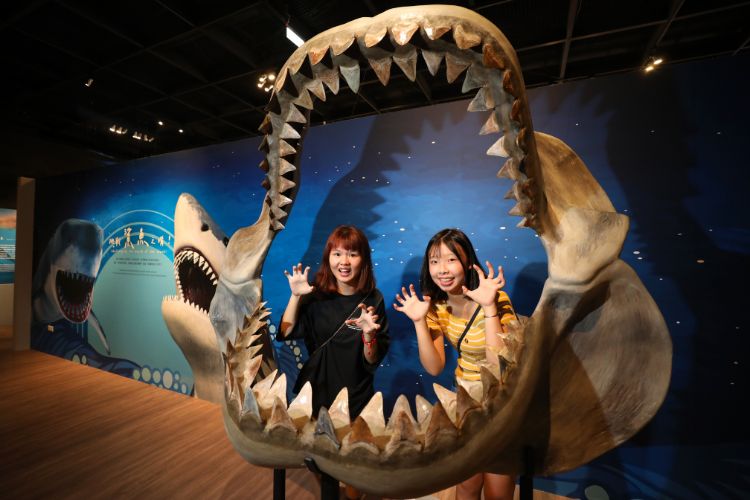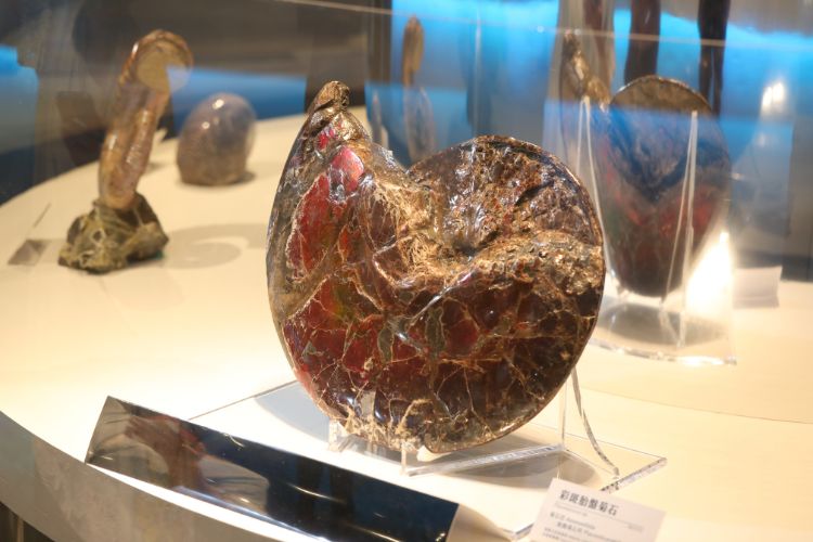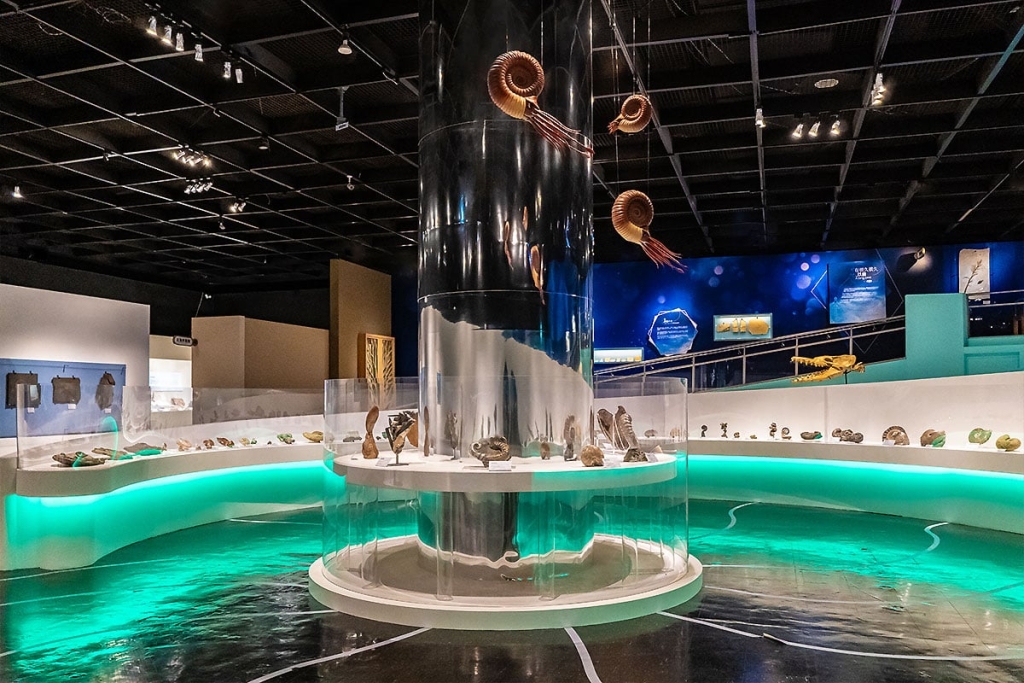 展廳正中央的「頭足崢嶸」單元採螺旋狀設計,觀眾可走上展場最高處俯瞰,將巨大的「鸚鵡螺」與多件頭足生物化石精品盡收眼底。「軍備競賽」有真實的鯊魚嘴部利牙化石,觀眾可以走進鯊魚的血盆大口拍照打卡。